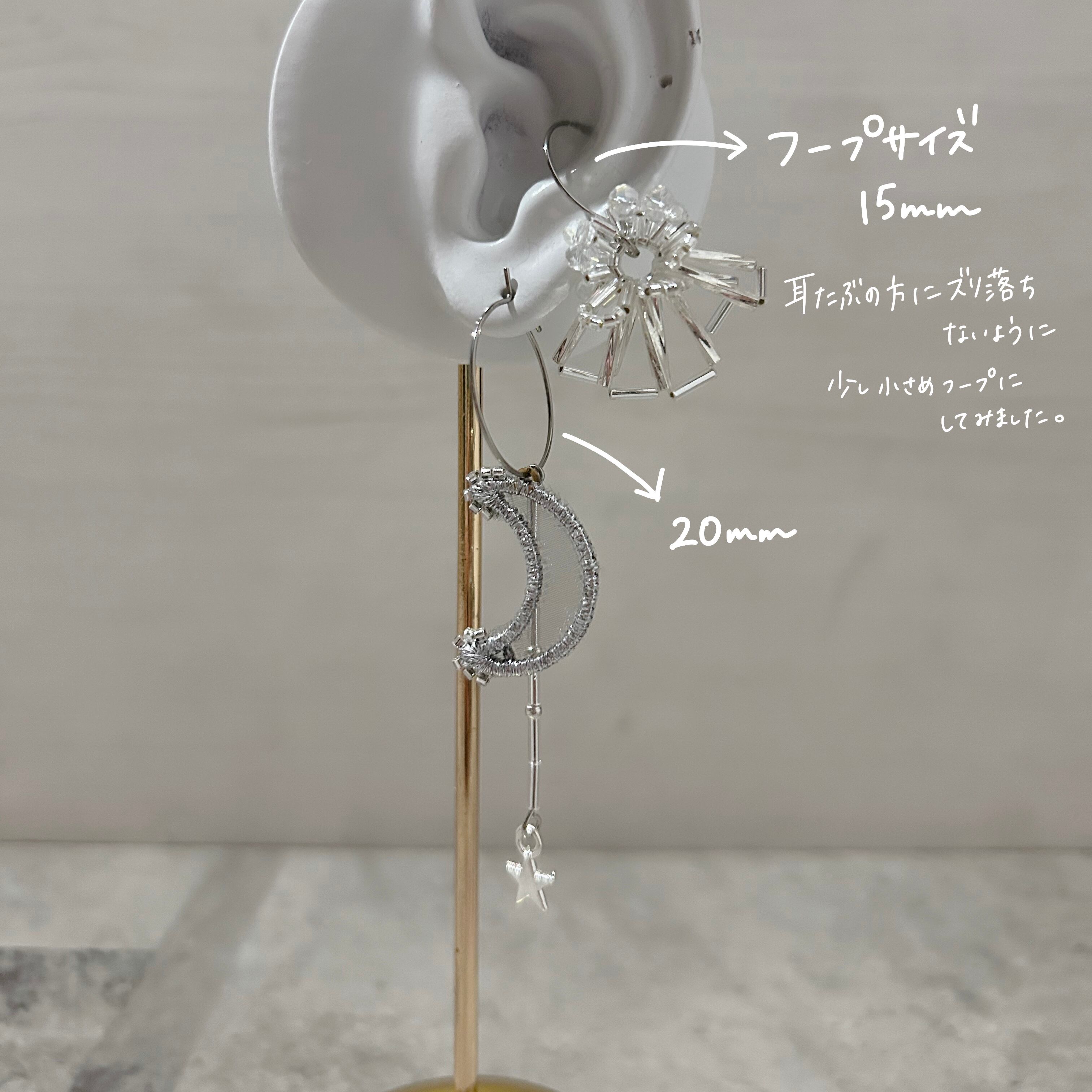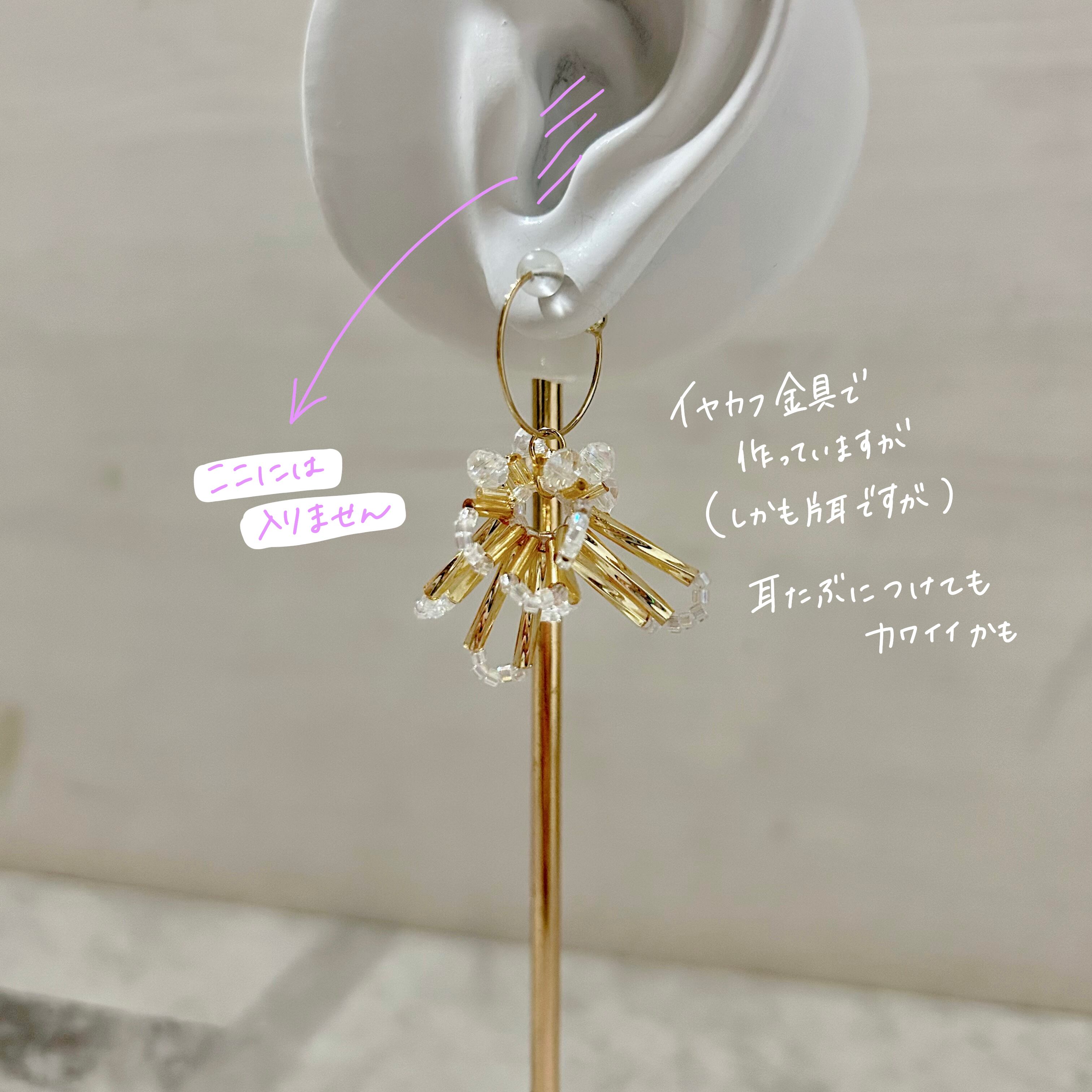 イヤリングの場合、イヤカフと同じ金具で作っている為、耳たぶを挟むだけでは心もとないと思われる方もいらっしゃるかもしれません。